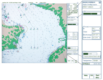 The electronic chart can be overlaid with a variety of navigation data such as radar echo images, ship's position, heading, speed and others to facilitate safe and efficient vessel operation.